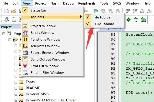 - 打开 Keil 的编译工具栏(一般情况已经打开了)