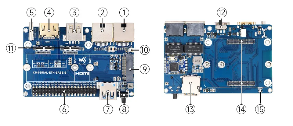 CM5-DUAL-ETH-BOX-B 是一款可以搭配树莓派 Compute Module 5 使用的底板,强大功能,板载 1 路 USB 3.2 Gen1、1 路 USB2.0、M.2 M KEY 、40PIN 排针接口以及双网口。