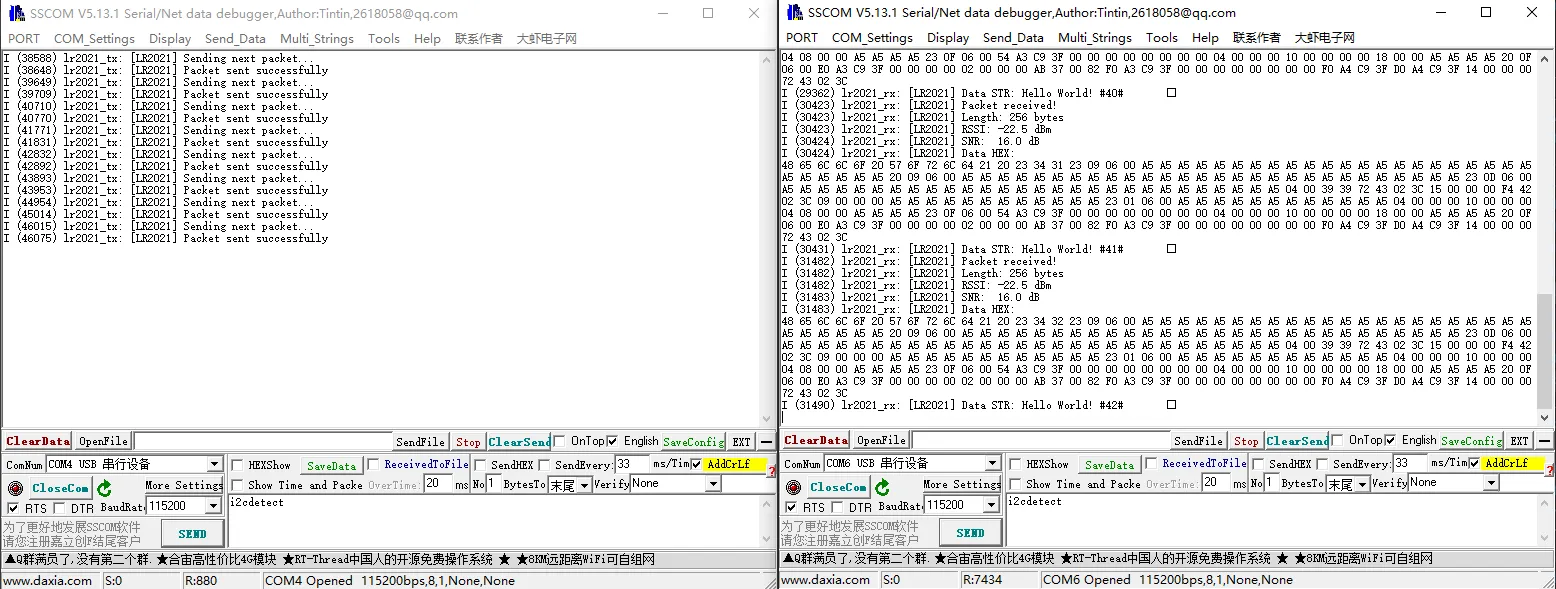 程序编译下载完成,打开串口监控可以看到打印发送完成的日志,如下图所示(搭配02_lr2021_rx):