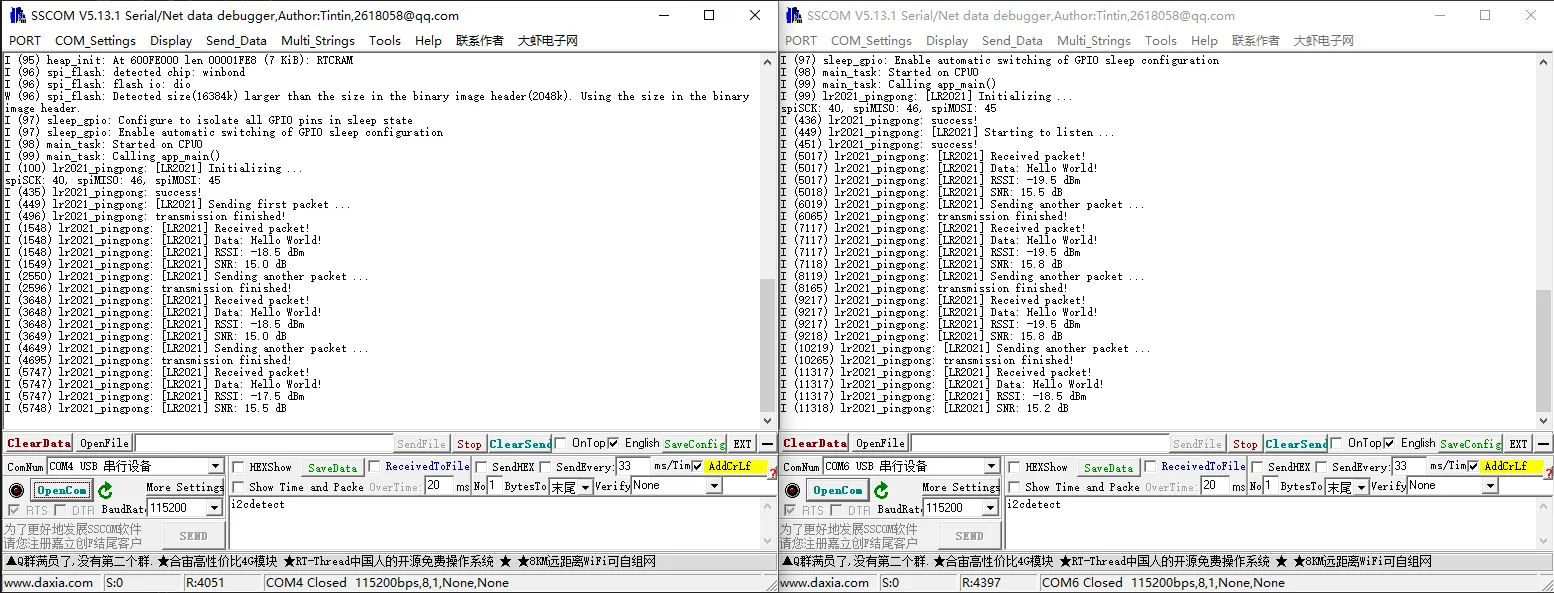 - 两台 ESP32 烧录程序后自动建立双向 LoRa 链路,循环互发数据