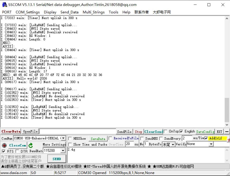 - 程序运行后自动完成 OTAA 入网,周期性上报数据并接收服务器下行