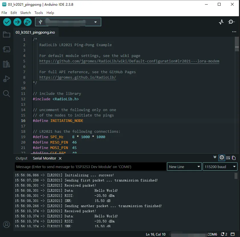 程序编译下载完成,打开串口监控可以看到实时接收日志,包含数据内容、RSSI、SNR 信息,如下图所示(搭配01_lr2021_tx):