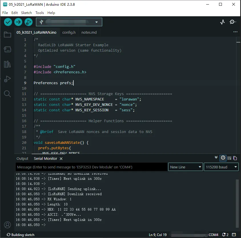 SPI1.setSCK/setRX/setTX:RP2040 硬件 SPI1 引脚重映射配置SPI1.begin():初始化树莓派 Pico 硬件 SPI1 总线radio.irqDioNum = 11:配置 LR2021 中断映射引脚,必须在初始化前设置radio.XTAL = true:开启外部晶振,保证 LoRaWAN 频点精度EEPROM.begin(256):初始化 RP2040 片上 Flash 模拟 EEPROMrestoreLoRaWANState():从 EEPROM 恢复会话信息,实现快速重连node.beginOTAA()/activateOTAA():OTAA 入网相关关键函数saveLoRaWANState():入网成功后保存会话信息到 EEPROMnode.sendReceive():发送上行数据并自动监听下行printHex/printAscii:格式化打印下行数据
