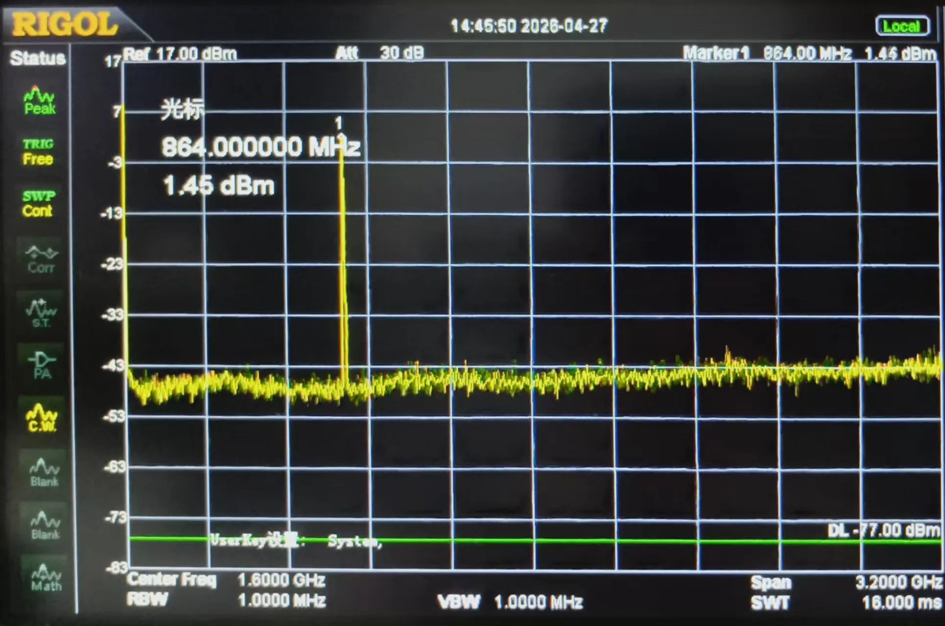 串口打印初始化与发射启动状态,可使用频谱仪/接收模块检测到连续射频信号,如下图所示: