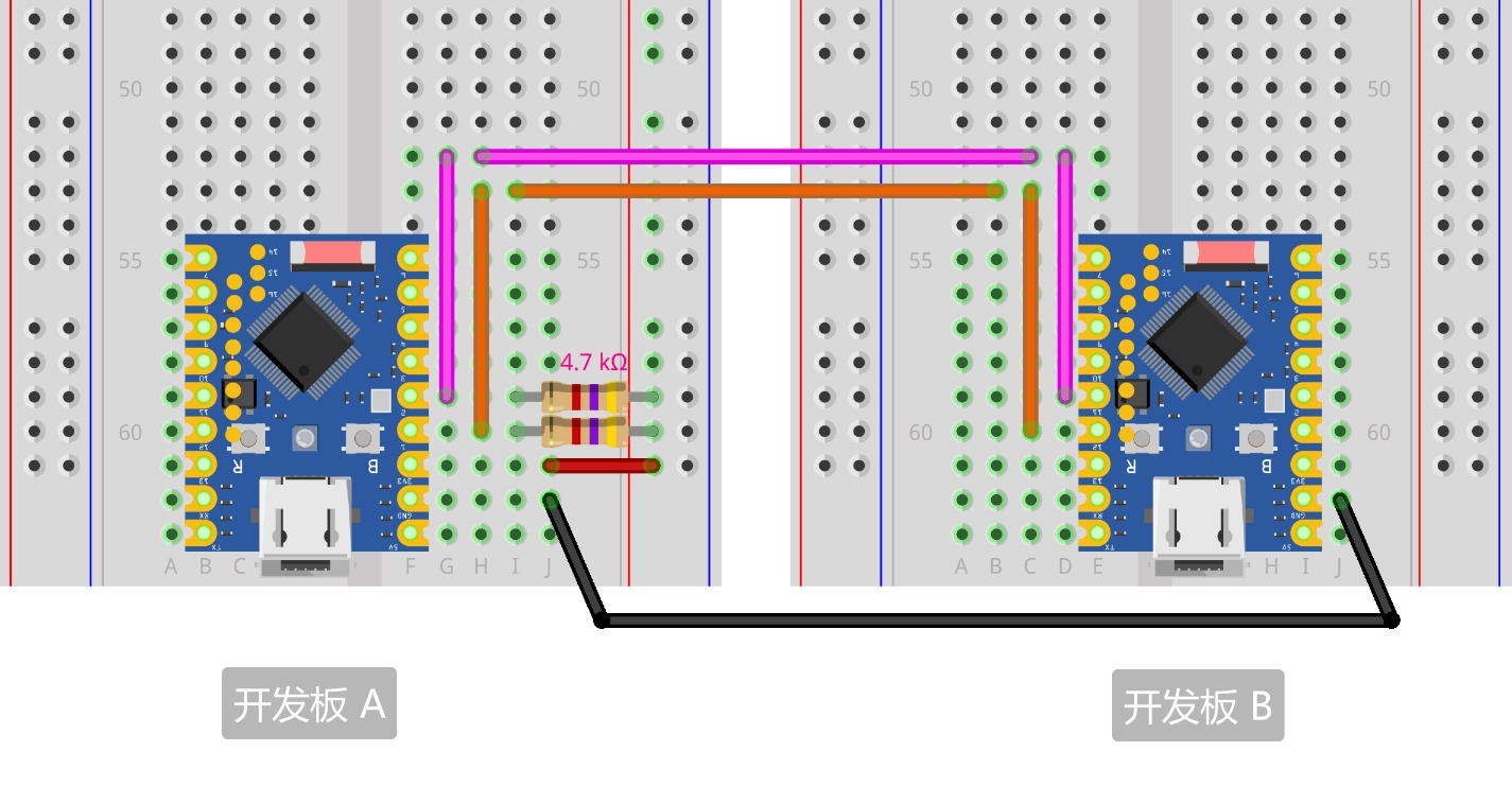 此示例在不外接上拉电阻情况下也能运行。但为了保证信号稳定,建议连接上拉电阻 ( 3.3V 可以取自任意一块开发板):