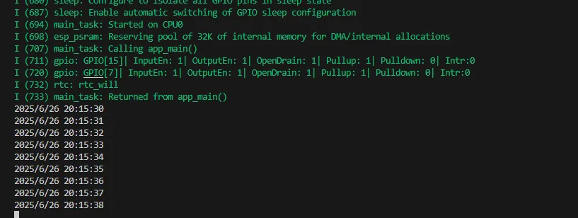 void i2c_rtc_loop_task(void *arg):创建一个 RTC 任务来实现 RTC 功能,每隔 1 秒读取一次 RTC 芯片的时钟,然后输出到终端。