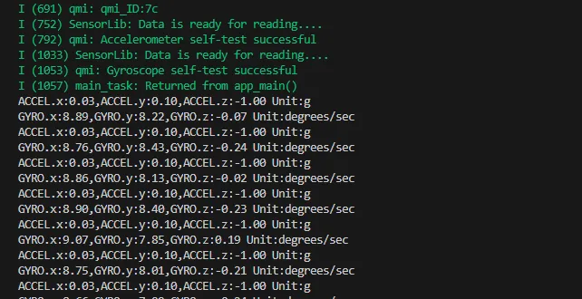 - 通过 I2C 协议,对 QMI8658 芯片进行初始化设置,然后每隔 200ms 读取对应的姿态信息打印到终端。