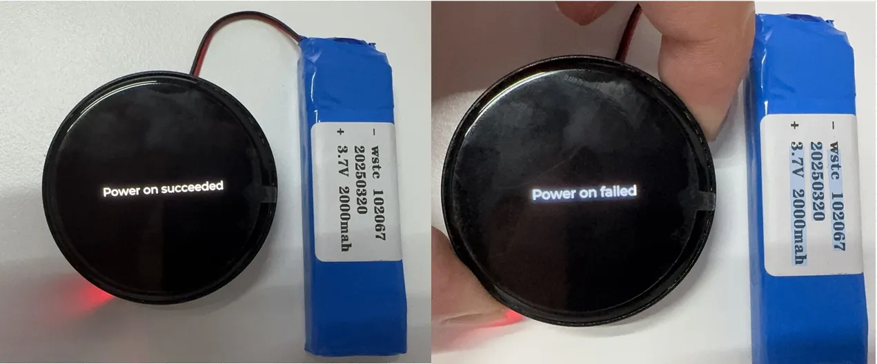 程序烧录完成后,断开 USB 供电,接入锂电池,通过长按 PWR 按键进行开机,如图: