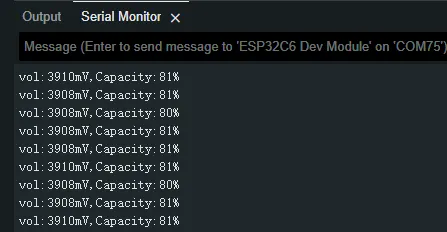 程序编译下载完成,打开串口监控可以看到打印输出的电压和电池容量,如下图所示: