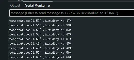 打开串口监控,可以看到打印输出的温湿度数据,如下图所示: