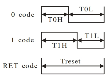 参数 描述 时间 容差 T0H 0 码,高电平时间 0.4µs ±150ns T0L 0 码,低电平时间 0.85µs ±150ns T1H 1 码,高电平时间 0.8µs ±150ns T1L 1 码,低电平时间 0.45µs ±150ns RES 低电平时间 大于 50μs - "0" 码:一个较短的高电平(约 0.4µs)+ 一个较长的低电平(约 0.85µs)。