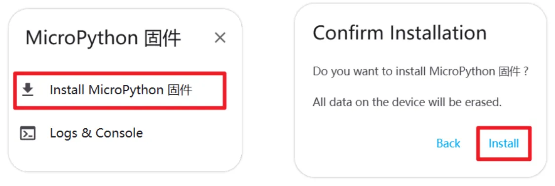 MicroPython 需要运行在其固件,因此首次使用前需烧录对应的固件。请参考以下烧录方式。