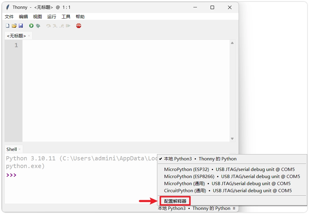 2. 配置解释器:打开 Thonny,点击窗口右下角的解释器状态框(初始可能显示为 '本地 Python'),然后选择 配置解释器