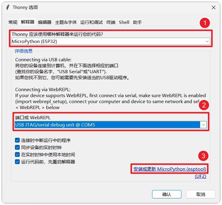 此方法操作简便,适合大多数场景。Thonny 会自动下载固件。