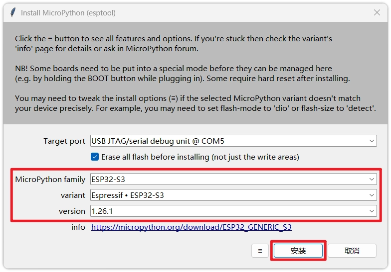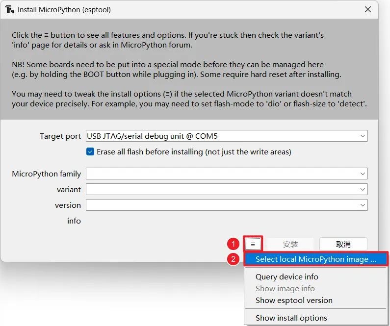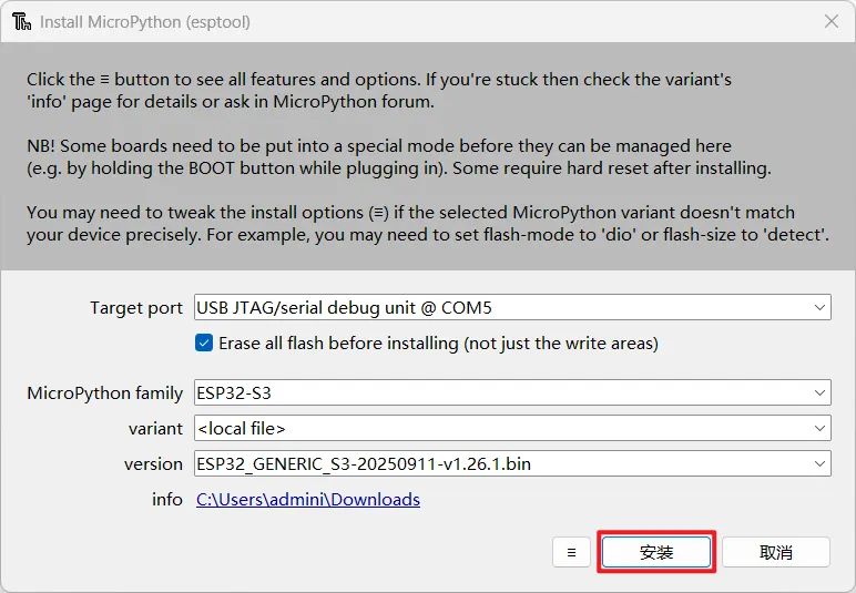 4. 选择固件:在 Install MicroPython(esptool) 窗口中配置以下参数: