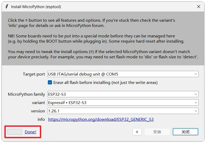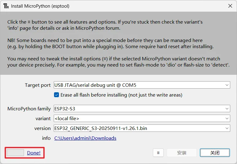 5. 开始烧录:点击 安装。Thonny 会自动擦除闪存并烧录新的 MicroPython 固件。等待进度条走完,直到出现 Done! 提示。