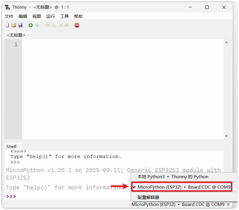 1. 重连设备:断开 ESP32 与电脑的连接,然后重新连接,并确保 Thonny 右下角的解释器已设置为 MicroPython (ESP32) 和正确的端口。