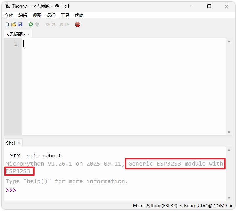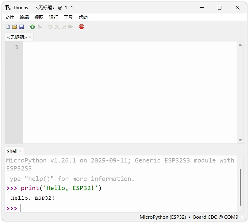 3. 检查提示符:连接成功后,Shell 窗口中应出现 MicroPython 的版本信息、开发板信息和 >>> 提示符,这表示已成功进入 ESP32 上的 MicroPython REPL 环境。