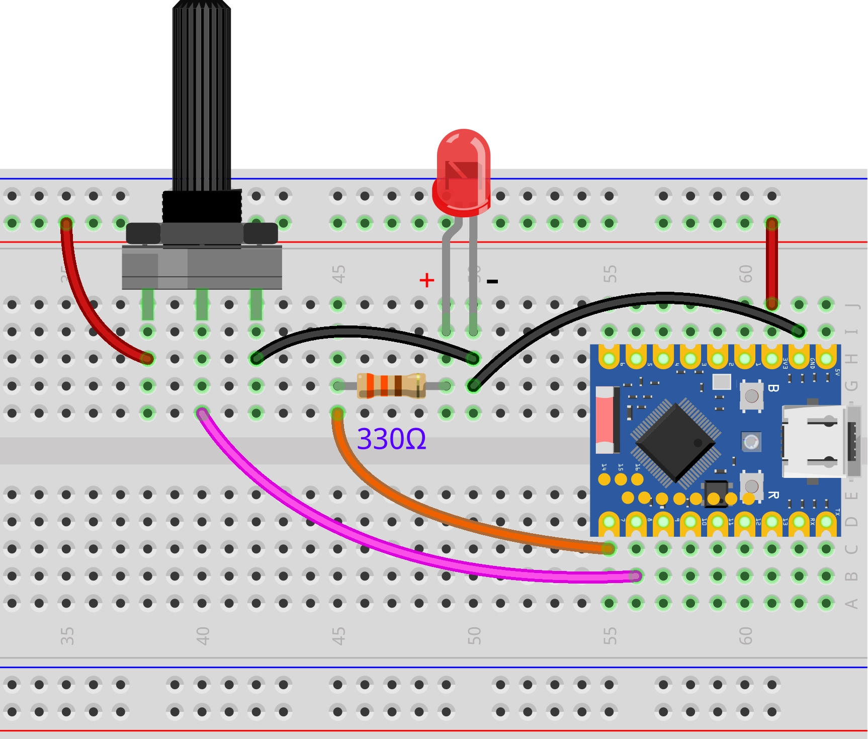 请尝试实现:通过调节电位器旋钮来控制 LED 灯的亮度,使旋钮位置与灯光亮度相对应