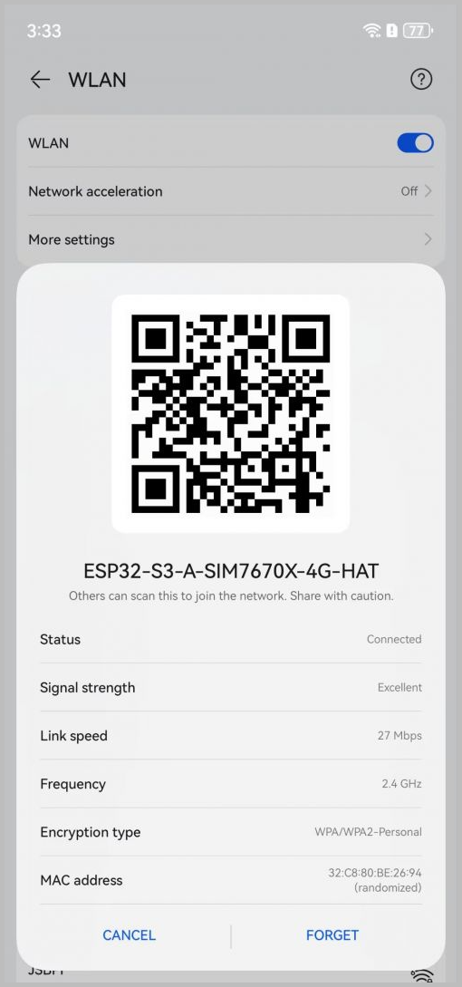 - 将开发板背面拨码开关 4G 开启,USB 关闭,重新上电开发板,等待炫彩 LED 显示红色,打开手机连接 WIFI:ESP32-S3-A-SIM7670X-4G-HAT,密码:12345678 即可上网