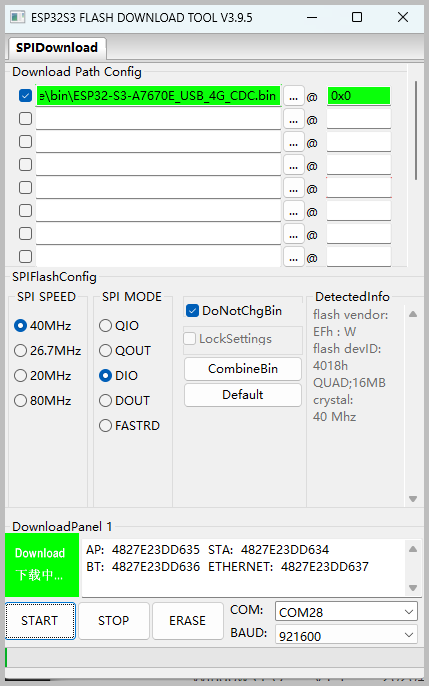 确认下载了对应型号的固件,切勿混淆 A7670E 与 SIM7670G 固件,并确保烧录时已正确勾选