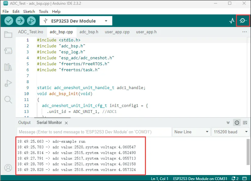程序编译下载完成,打开串口监控可以看到打印输出的 ADC 的值和电压,如下图所示: