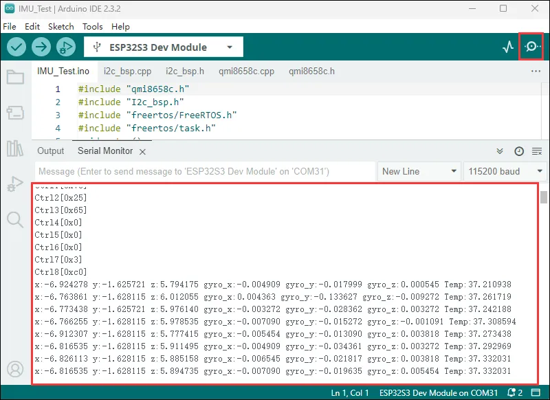 qmi8658c_example(void* parmeter):该函数初始化 QMI8658 设备,在无限循环中读取并打印加速度计、陀螺仪数据和温度数据,每 1 秒执行一次,旋转板子的过程中陀螺仪数据随着旋转越快而越大,加速度计会根据当前的位置计算出对应的加速度。