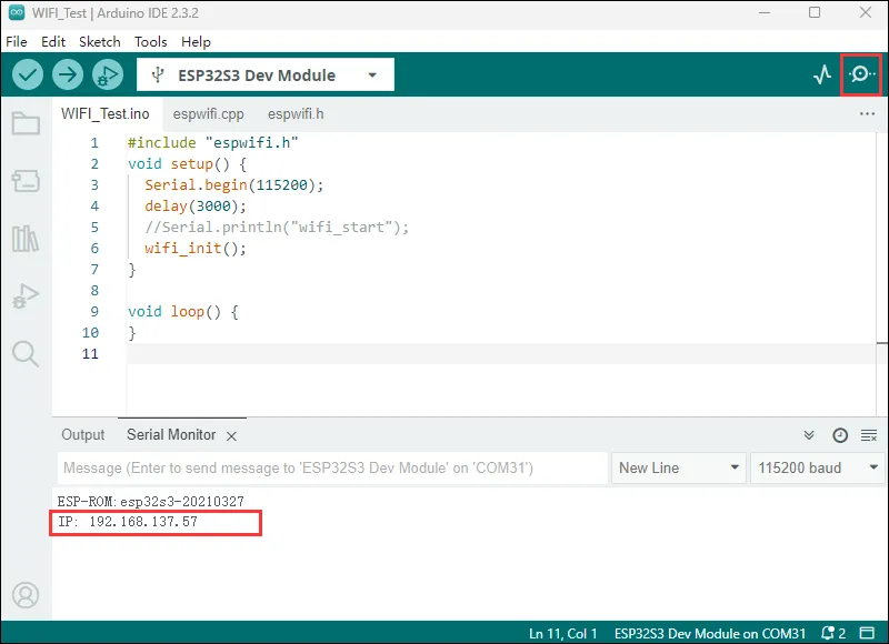 烧录完程序,打开串口终端,如果设备连接成功热点之后,会输出所获取的 IP 地址,如图: