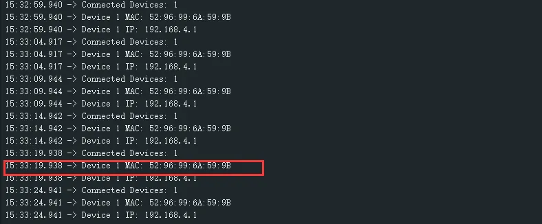 烧录完程序,打开串口终端,如果设备连接热点成功之后,会输出该设备的MAC地址,如图: