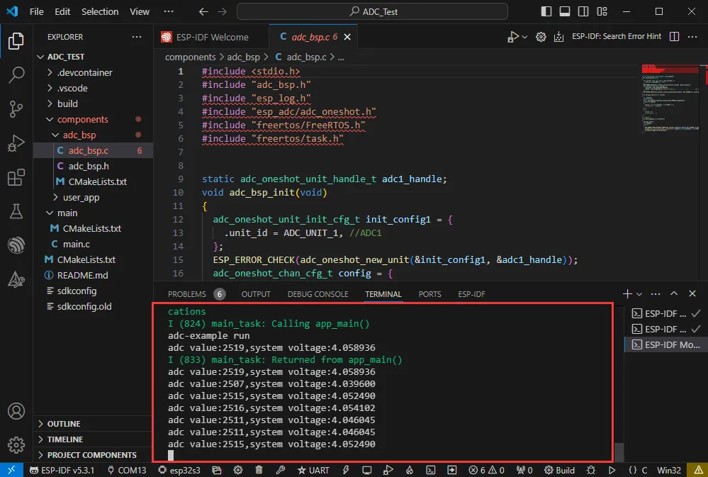 adc_bsp_init(void):初始化 ADC1,包括创建 ADC 单次触发单元并配置 ADC1 的通道 0。adc_get_value(float *value):读取 ADC1 通道 0 的值,并根据参考电压和分辨率计算出对应的电压值存储在传入的指针指向的位置,如果读取失败则存储 0。adc_example(void* parmeter):初始化 ADC 后,在一个无限循环中通过读取GPIO1上的ADC通道的值,并打印出原始 ADC 值和计算得到的系统电压值,每 1 秒执行一次。