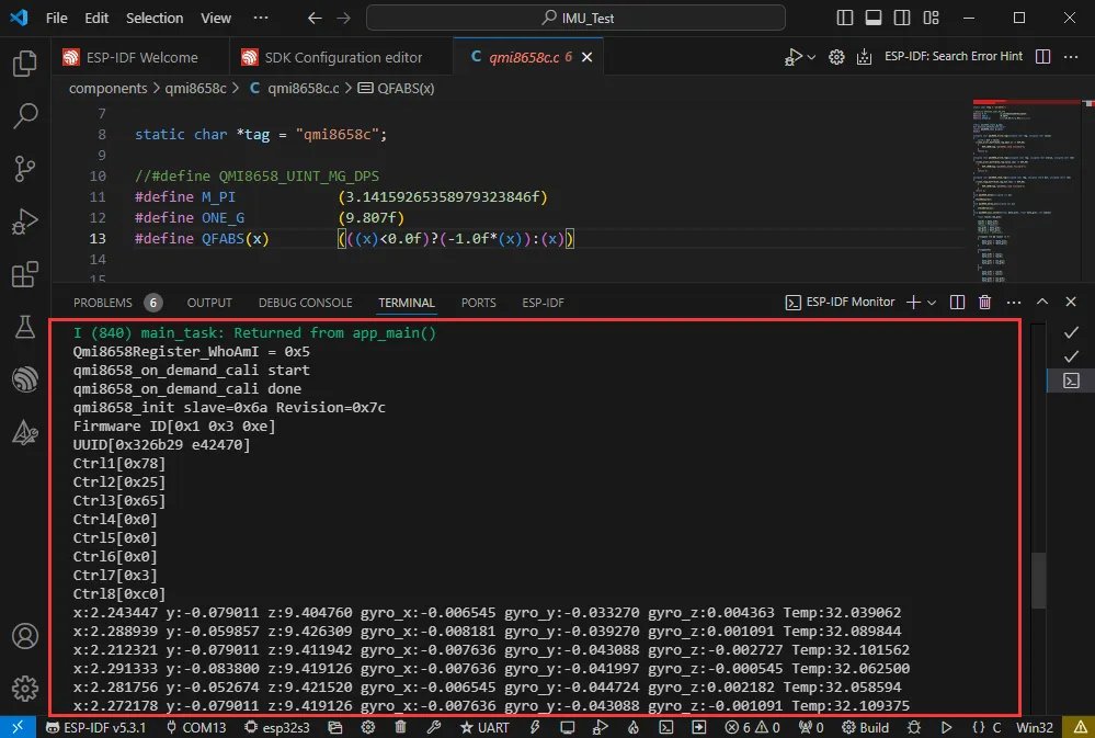 - 通过 I2C 协议,分别对 QMI8658 芯片进行初始化、间隔读取姿态数据,然后打印到终端。