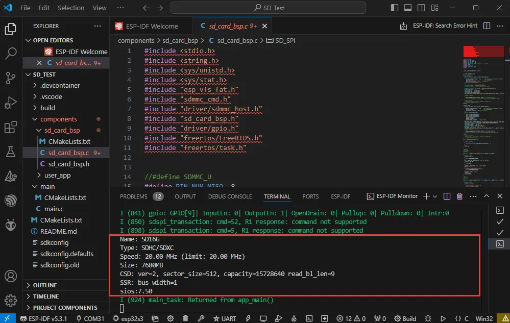 - 通过 SDMMC 方式驱动 SD 卡,成功挂载之后把 SD 卡信息打印到终端。