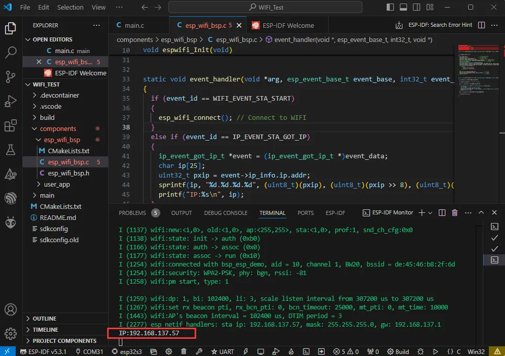 esp_wifi_bsp.c文件找到ssid和password,然后将其修改为当前环境中可用路由器的 SSID 和 Password。wifi_config_t wifi_config = {