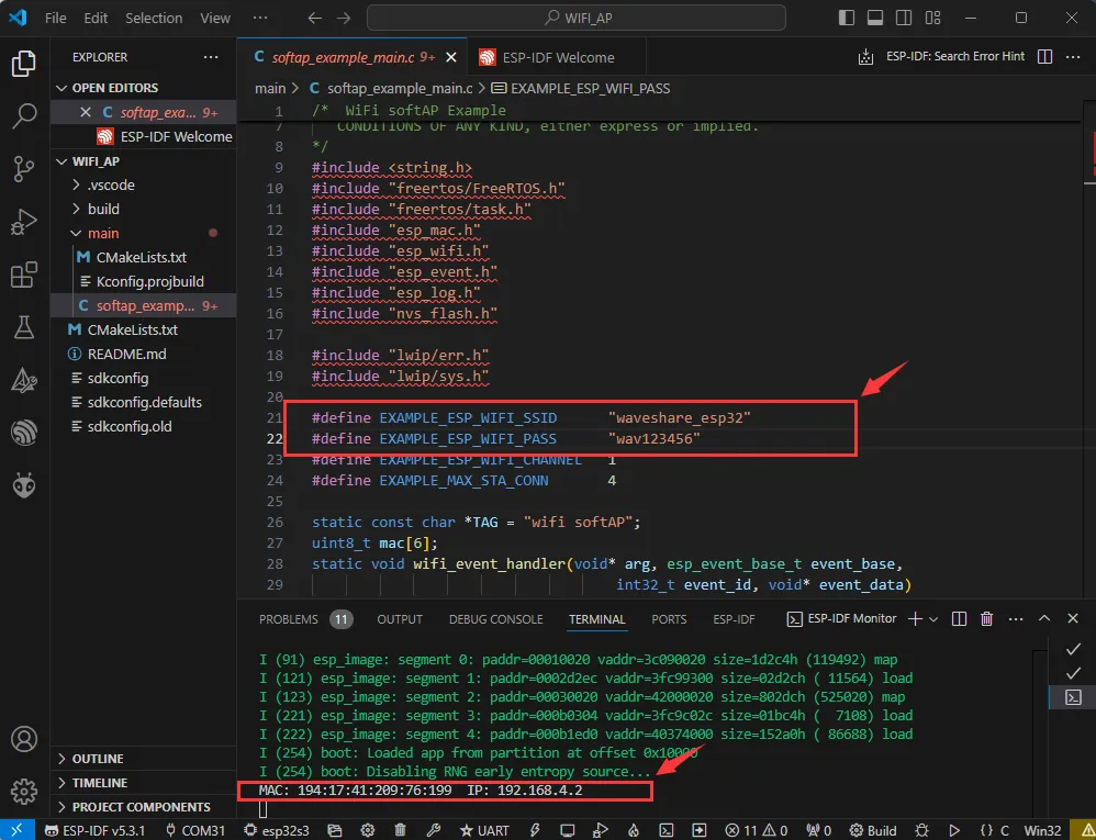 softap_example_main.c文件找到SSID和PASSWORD,然后手机或其他处于 STA 模式的设备即可使用该 SSID 和 PASSWORD 连接到开发板。#define EXAMPLE_ESP_WIFI_SSID "waveshare_esp32"
