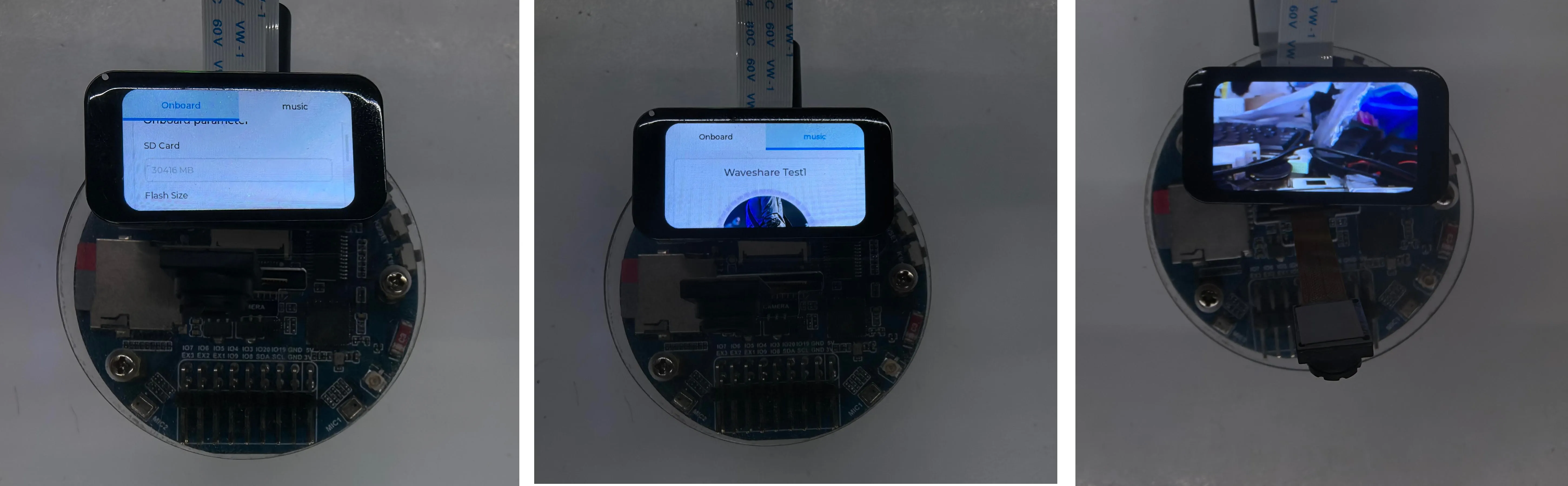 - 本示例演示了板载各个设备的功能,屏幕 2 显示 SD Card,Flash Size,背光调节滑动条等参数,屏幕 1 为音乐播放界面;另外,此示例增加语音识别功能,仅在播放音频前可使