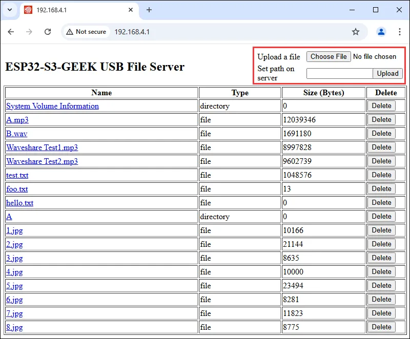 - 该例程可将 ESP32-S3-GEEK 用作具有无线访问功能的 USB 磁盘,配合 SD 卡存储可变成一个大容量的无线存储器,同时还可以连接 ESP32-S3-GEEK 的热点,进行 HTTP 文件服务器的上传和下载,极大程度的方便了用户的使用。适用于学习 ESP32 的 USB MSC 功能,可作为存储设备连接 USB 主机,支持不同存储方式,有回调函数处理各种事件,测试稳定性与可靠性