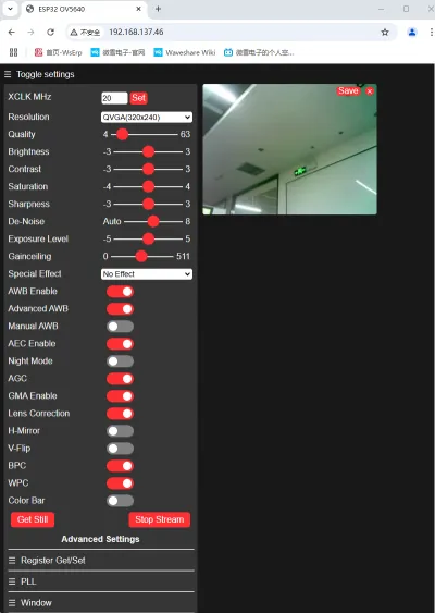 - 本示例演示了如何使用 ESP32-S3-LCD-2 驱动摄像头。在连接 WiFi 后,程序会创建一个网页服务器,用户只需在浏览器中输入设备的 IP 地址即可访问。网页上可以显示摄像头的图像,并支持分辨率、镜像等设置操作