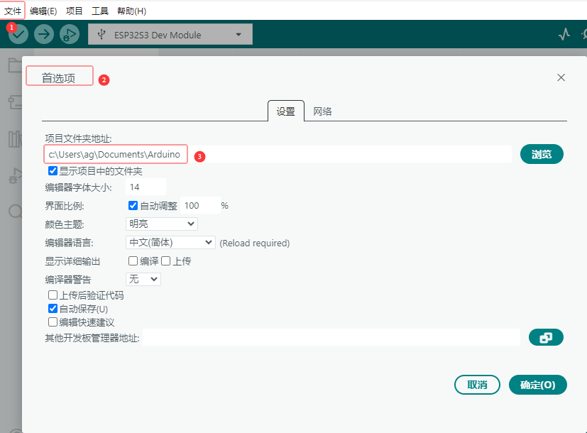 下载示例,进入到 ESP32-S3-LR1121-XF/esp32s3/Arduino 中,将 waveshare_lora_1121 复制到项目文件夹的 libraries 文件夹下,项目文件夹路径在 文件 -> 首选项 -> 项目文件夹地址 下查看
