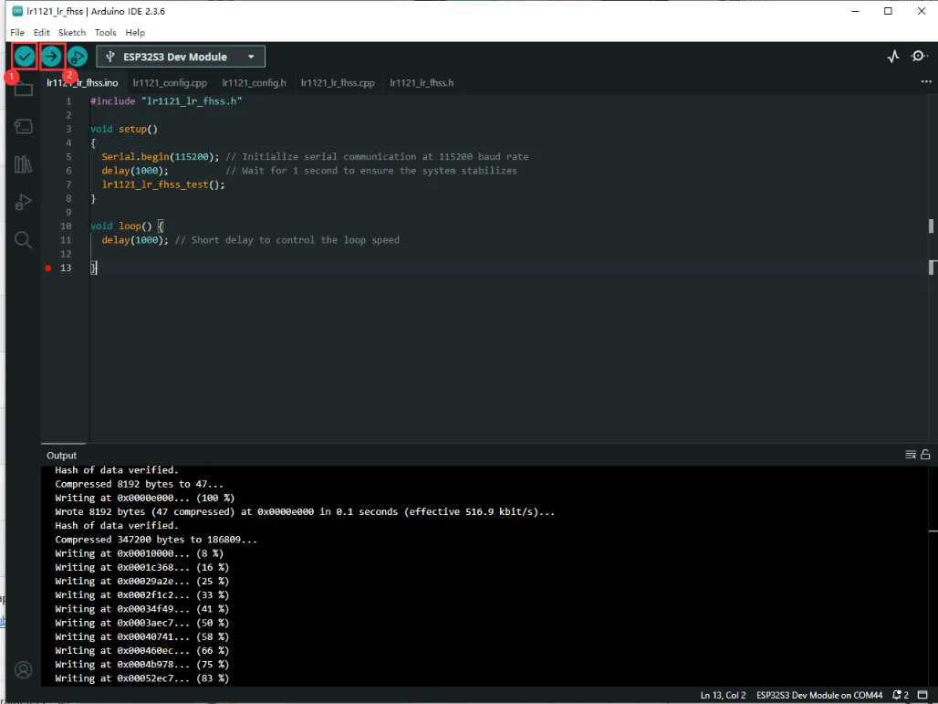 注意:ESP32-S3-LR1121 模块默认工作在收发器(Transceiver)模式。若要运行 LoRaWAN 协议,需先通过开发板烧录对应的固件。 示例可参考Demo中的 lr1121_firmware_update 示例,并运行 lr1121_firmware_update + lr1121_modem_05020001。