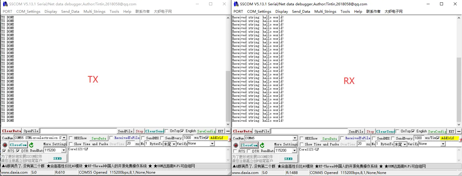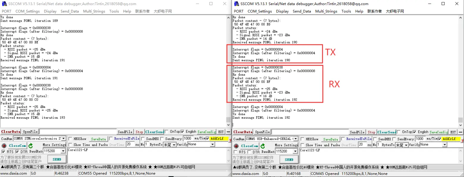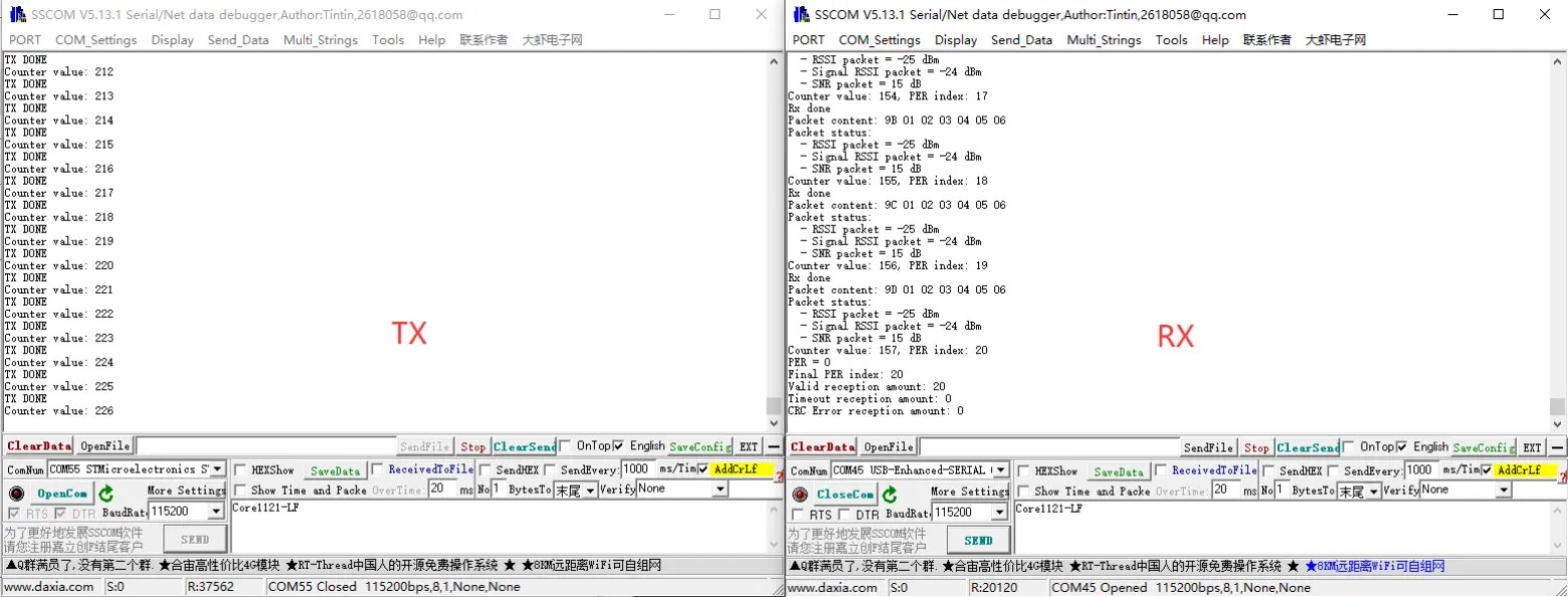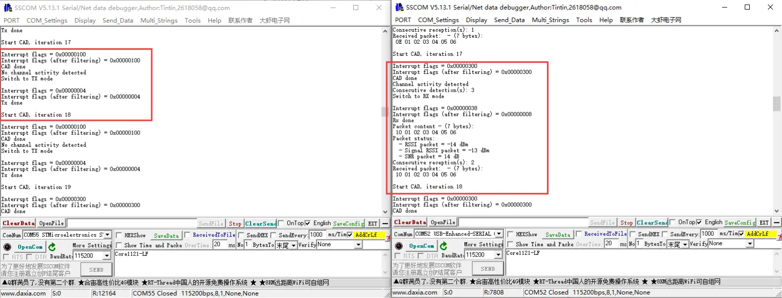 - 一台设备刷入 CAD_EXIT_MODE 为 TX,一台 CAD_EXIT_MODE 为 RX,就可开始测试