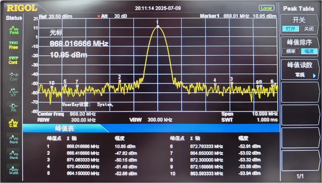 - 使用 lr1121_tx_cw 发出一个频率 868MHz, 功率 22dBm 的信息进行测试,效果如下: