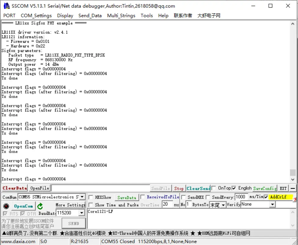 - 该应用程序将设备设置为写模式,自动发送数据,搭配 lr1121_read 可以实现点对点通信。