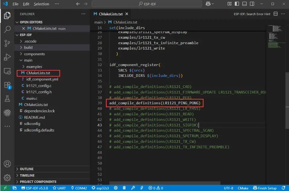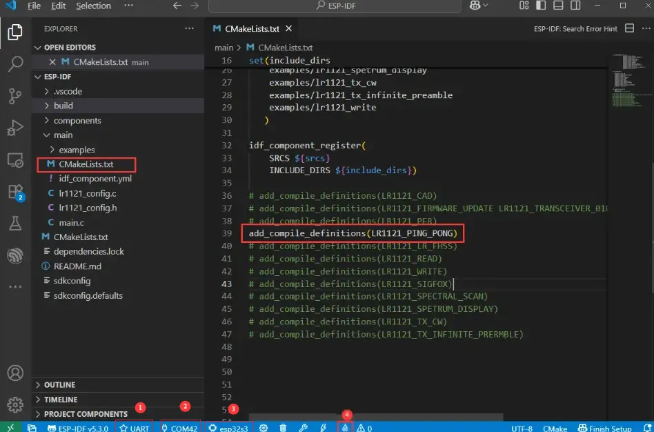 ESP-IDF 的示例使用需要配置 ESP32-S3-LR1121/esp32s3/ESP-IDF/main/CMakeLists.txt 的脚本文件,默认为 lr1121_ping_pong 示例,如果需要其他示例,像下图去解除注释即可:
