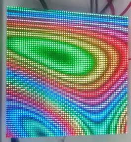 loop():持续生成整屏动态特效,用于验证带移位寄存器驱动芯片面板的显示兼容性。for (int x ...)/for (int y ...):遍历整块屏幕,对每个像素分别计算颜色值。sin8()、sin16()、cos16():结合坐标和time_counter生成连续变化的颜色索引。ColorFromPalette(currentPalette, (v >> 8) + 127):根据中间值从调色板中映射出最终颜色。dma_display->drawPixelRGB888():将 RGB 颜色逐点写入 DMA 显示缓冲区。time_counter、cycles、fps:分别用于驱动动画变化、控制换色周期和统计绘制帧率。if (cycles >= 1024):定期重置动画参数并随机切换调色板,便于观察不同色彩下的显示效果。Serial.printf_P():周期输出 FPS 信息,用于评估当前图案绘制速度。