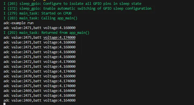 - 通过 GPIO 连接的模拟量电压经过 ADC 转换成数字量,然后通过计算得到实际的锂电池电压,并打印到终端。