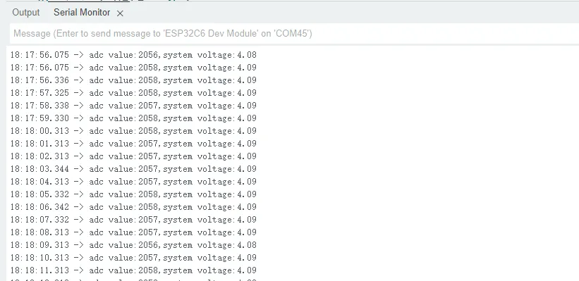 - 通过 GPIO 连接的模拟量电压经过 ADC 转换成数字量,然后通过计算得到实际的锂电池电压,并打印到终端。