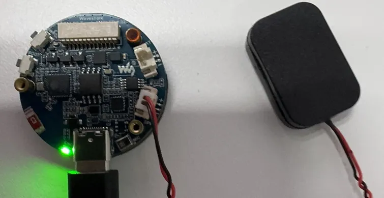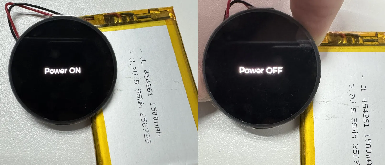 程序烧录完成后,断开 USB 供电,接入锂电池,通过长按 PWR 按键进行开机,如图: