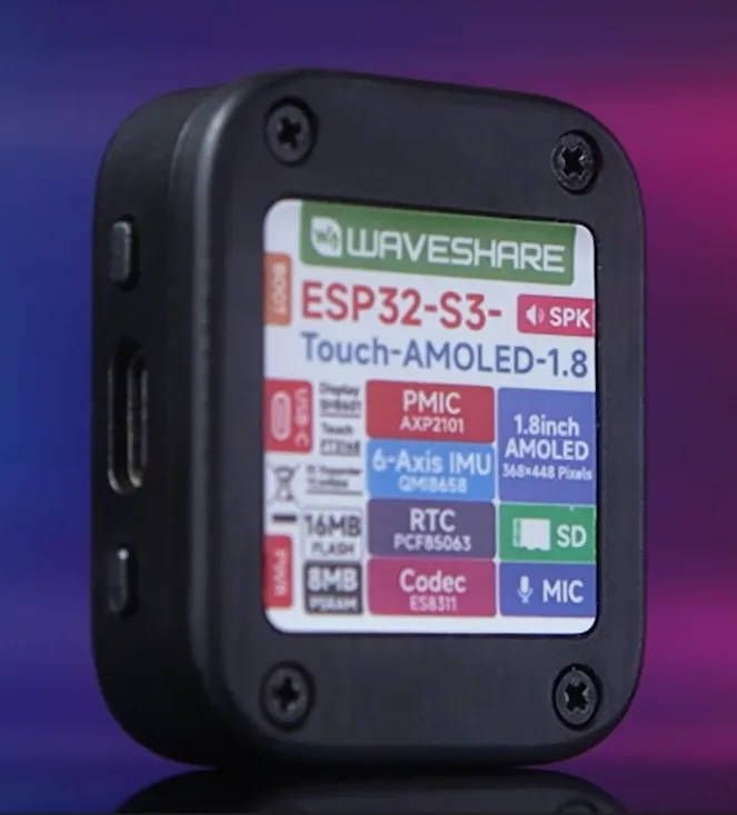 ESP32-S3-Touch-AMOLED-1.8 是一款微雪 (Waveshare) 设计的高性能的微控制器开发板。在较小的板型下,板载了 1.8 英寸电容触摸 AMOLED 屏、电源管理芯片、六轴传感器(三轴加速度计与三轴陀螺仪)、RTC、SD 卡槽、麦克风、扬声器等外设,方便开发并嵌入应用到产品中。