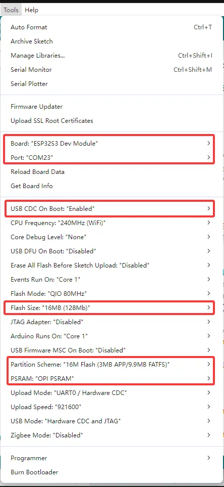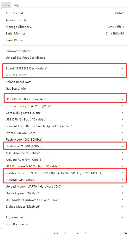 - Arduino 工程参数设置,Partition Scheme: "ESP SR 16M (3MB APP/7MB SPIFFS/2.9MB MODEL)"