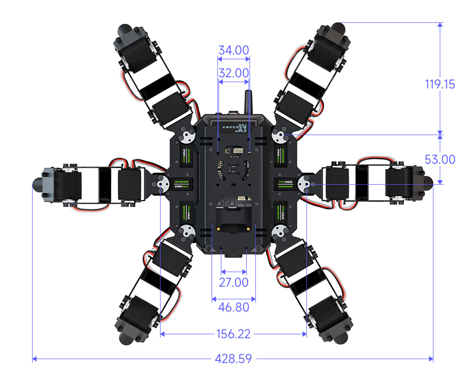 - 六节 18650 电池,4000mAh 大容量,输出电流更大,舵机动力更强。